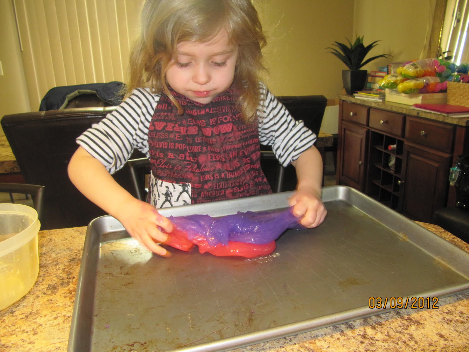 Pour glue into bowl. Fill up empty glue bottle 3/4 way with liquid starch. Add to glue. Add 5-6 food drops of coloring. Stir with spoon until food coloring is blended. Mix with hands until slime gels. Rinse slime under water and move to cookie sheet. Mix and play until the slime is no longer sticky. Store in plastic bag or container.